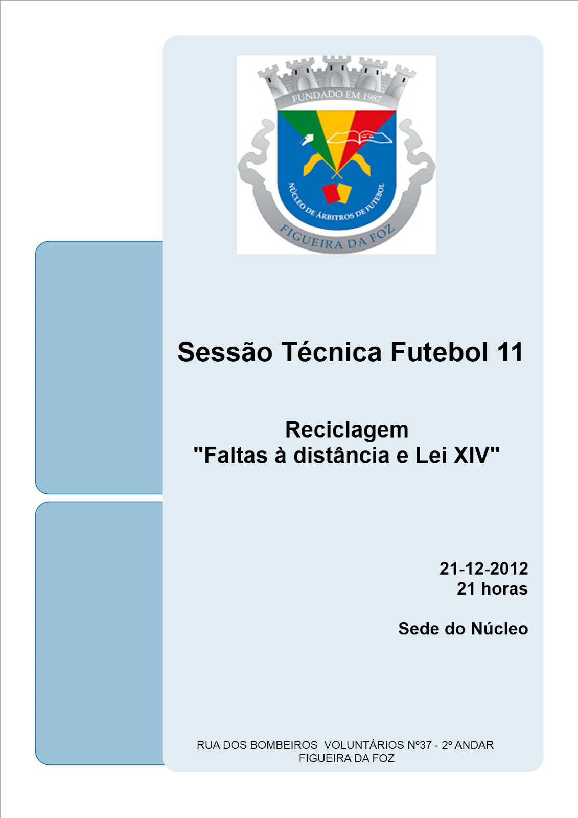 O Núcleo de Árbitros da Figueira da Foz organiza na próxima sexta feira (16-11-2012) pelas 21horas na sede do Núcleo uma sessão técnica, "Esmiuçar o Relatório de Jogo" com o Observador C1 Luís Ferreira.